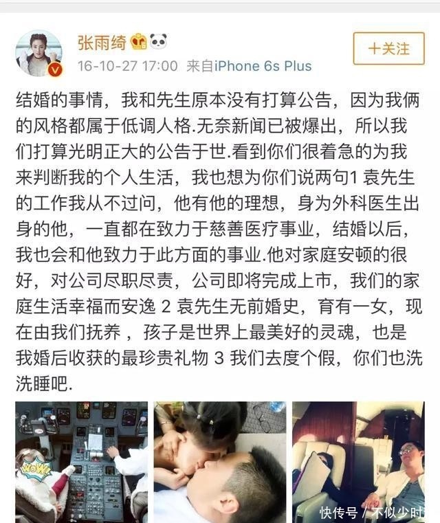 谁料2016年10月,张雨绮突然高调宣布与袁巴元登记结婚。