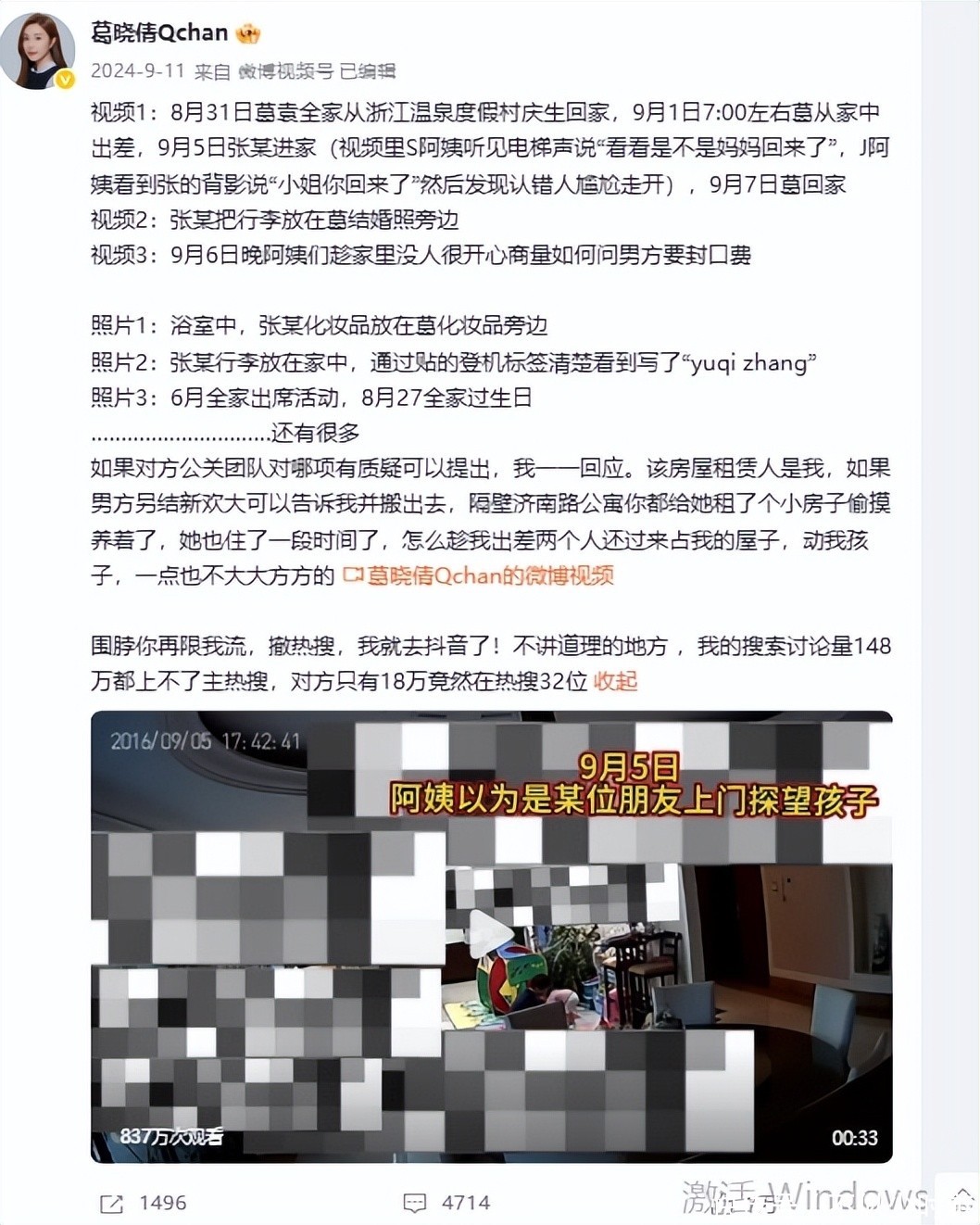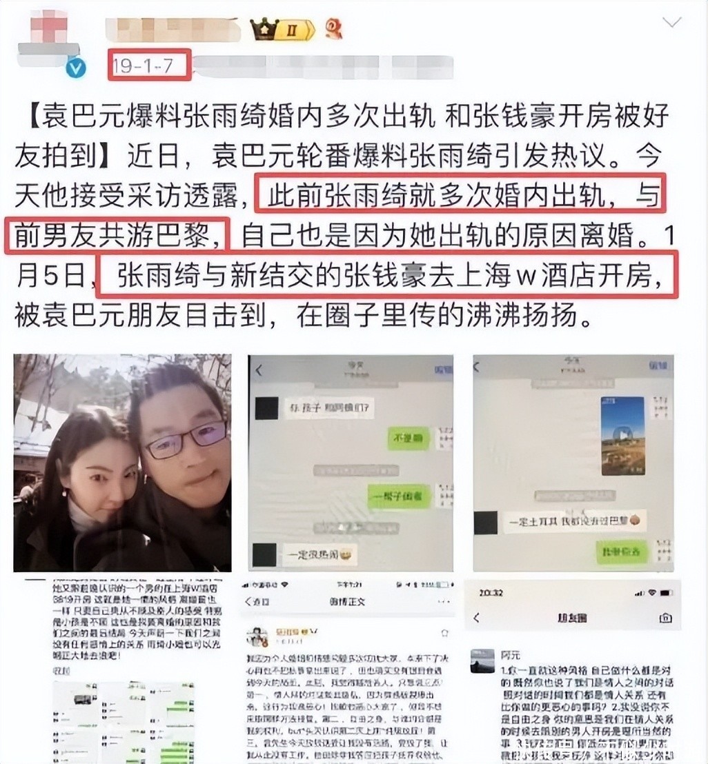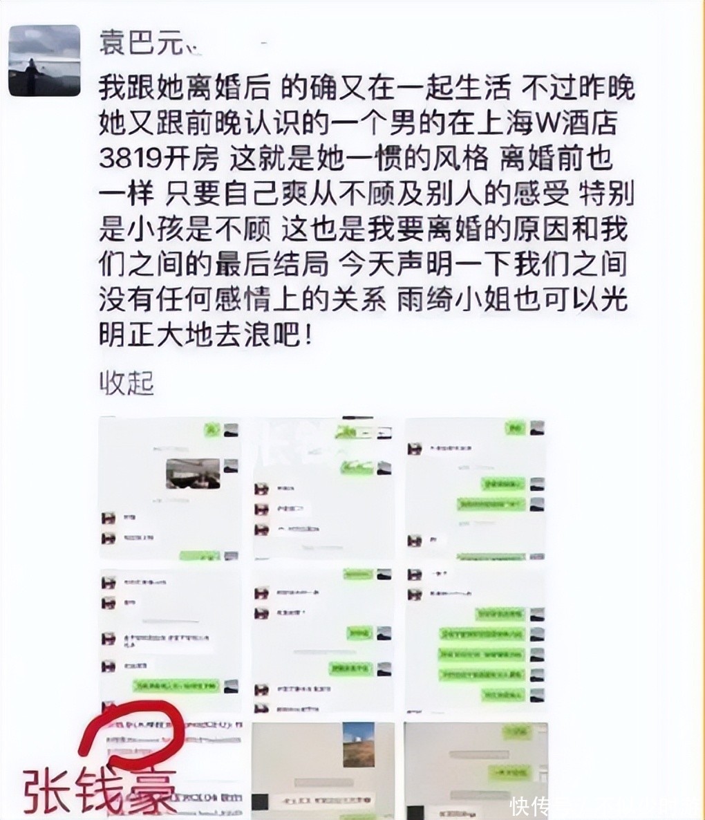 他公开指控张雨绮在婚姻存续期内多次与其他男性发生亲密关系,附上详实聊天记录、酒店入住凭证、跨城行程截图等证据链,连房间号与入住时间均标注清晰。