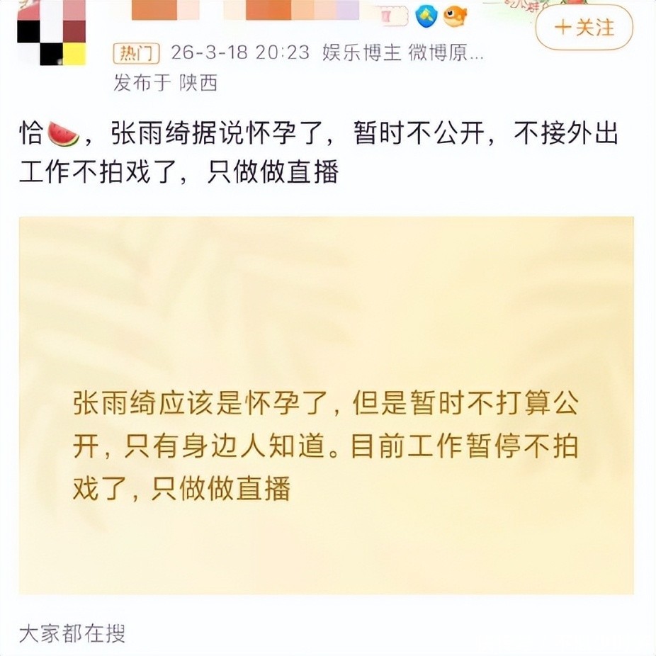 多位娱乐资讯账号援引所谓“张雨绮团队工作人员”的说法,宣称她目前已确认怀孕,正进入静养阶段,所有影视项目及公开行程均已暂停,唯独直播业务照常运转。