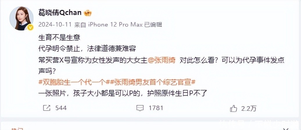 此次葛晓倩再度出击,更是直指代孕本质:“连成为母亲都要绕开生命伦理,这般投机取巧之人,何谈母爱尊严?”